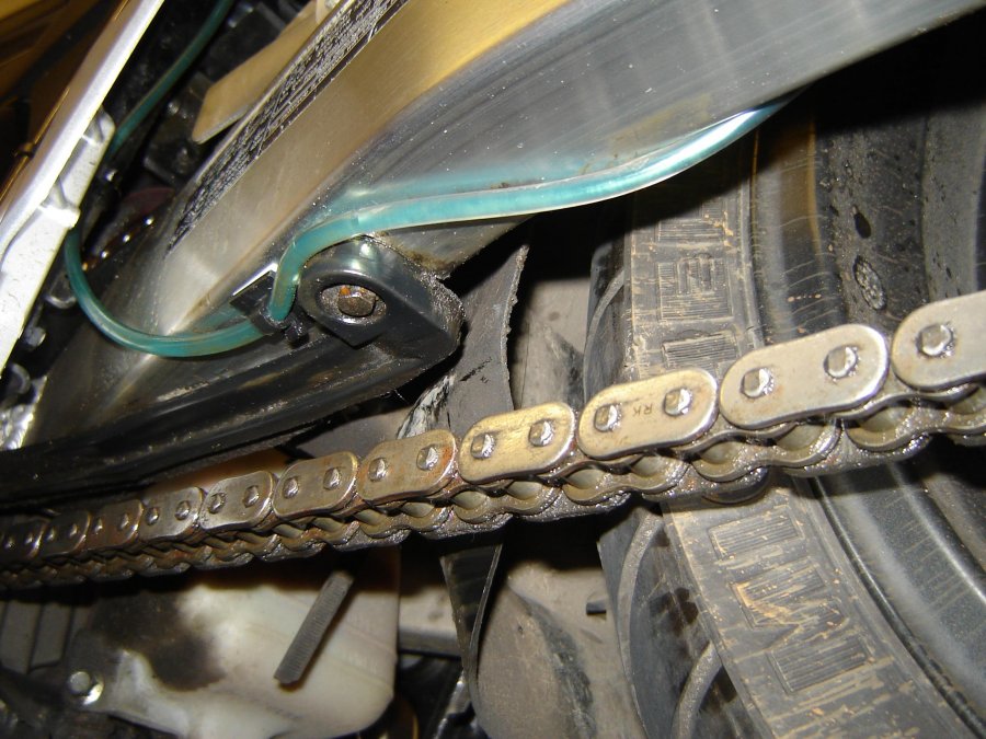 The Dispenser assembly can be secured on the chain guard bolt using the small dispenser plate and clip. The delivery tubing can be routed along the swing arm using self - adhesive cable clips. See our easy step installation guide - Dispenser Positioning. The nib should lightly  touch the face of the rear sprocket, with the slash cut facing outwards.