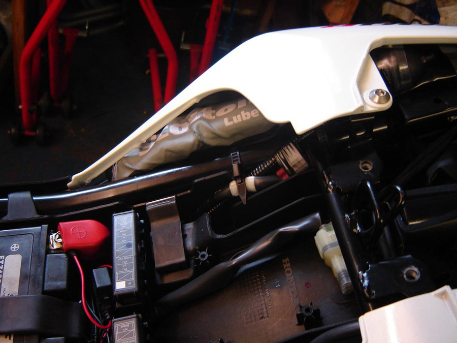 After you are happy with the placement of both the reservoir and the dispenser secure all parts before starting with the routing of the oil delivery tube. Take your time to find the best and most secure routing, avoiding hot engine and exhaust parts and taking suspension movement into account.