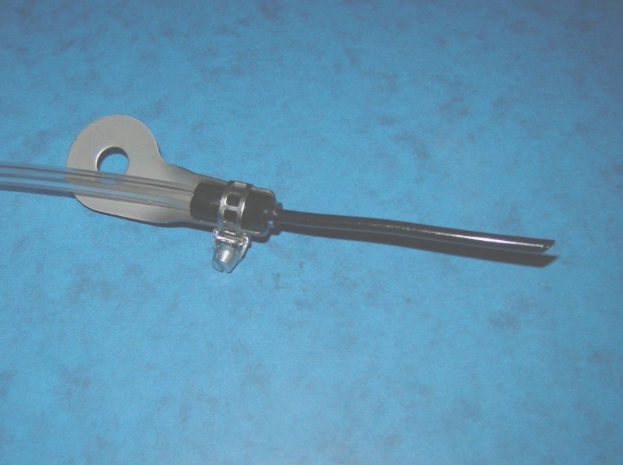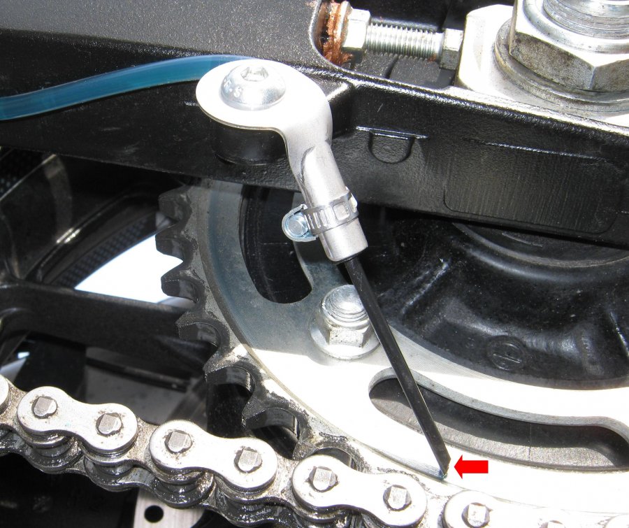 The Dispenser Assembly can be secured to the paddock stand bobbin mount using the small Dispenser Plate & Clip. The delivery tubing can be routed along the swing arm using self- adhesive cable clips. For further information see our easy step installation guide - Dispenser Positioning. The nib should feed the rear sprocket with the cut face facing outwards.