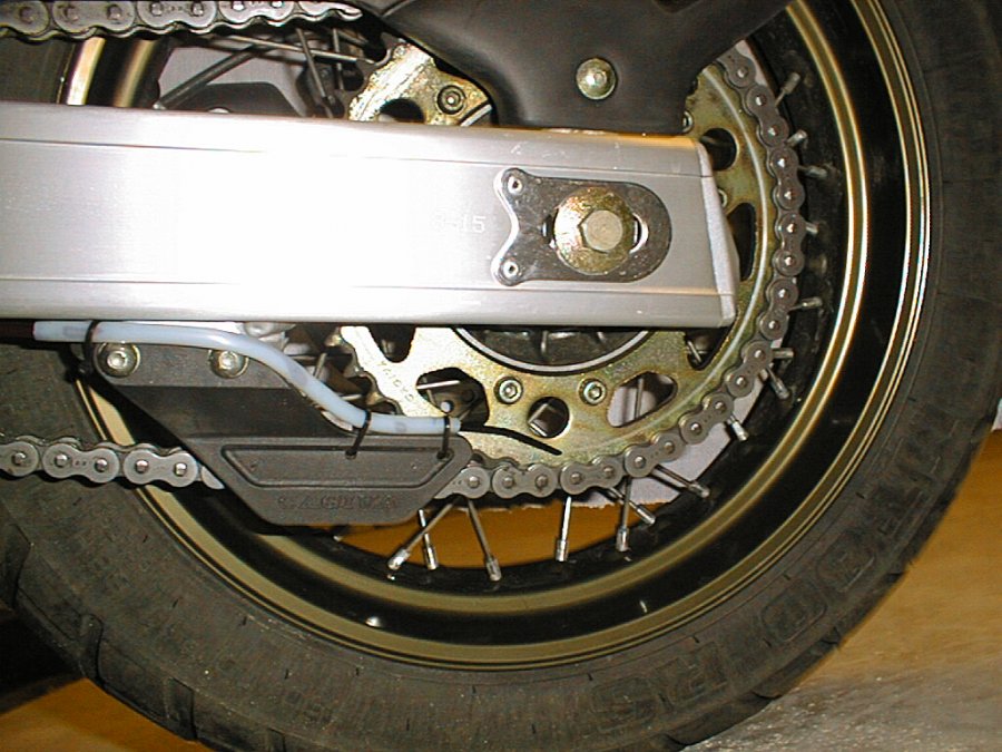 The Dispenser assembly can be secured on the chain guard bolt using the small dispenser plate and clip. The delivery tubing can be routed along the swing arm using self - adhesive cable clips. See our easy step installation guide - Dispenser Positioning. The nib should lightly  touch the face of the rear sprocket, with the slash cut facing outwards.