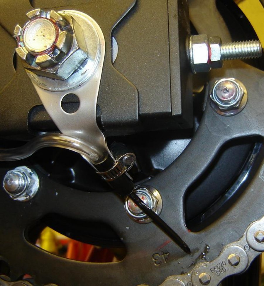 The delivery tubing can be routed along the swing arm using self- adhesive cable clips and the dispenser can be secured on the rear spindle using a dispenser plate & clip. For further information see our easy step installation guide - Dispenser Positioning. The nib should feed the rear sprocket, with the cut face outwards.