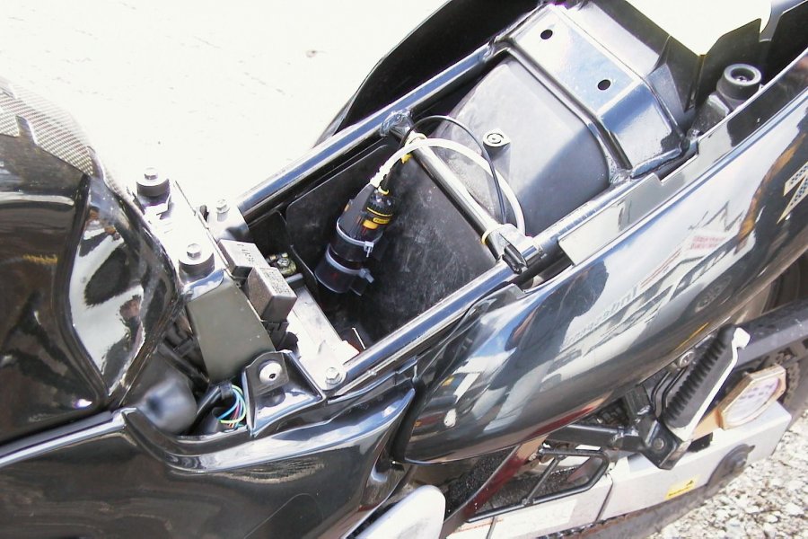 The reservoir can be mounted under the seat. The more vertical the reservoir is mounted the better. Avoid positioning the reservoir completely horizontally, as this will limit the available range. Remember to avoid exhaust and engine components. For further information, see our easy step installation guide – Reservoir Positions.