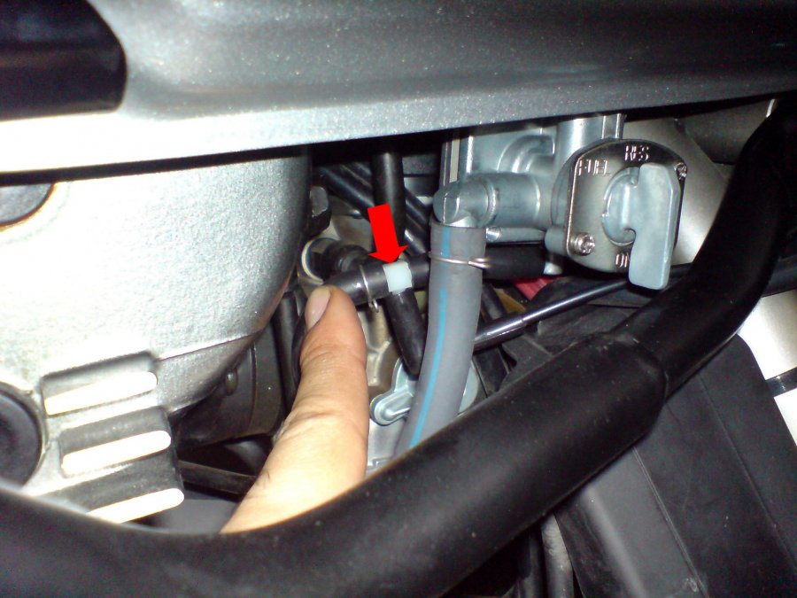Locate the vacuum – There is a vacuum pipe to the fuel tap. Cut into this pipe and insert the special 6mm T-Piece, available from Scottoiler. Then press the Damper Elbow onto the third leg of the tee. For further information see our easy step installation guide - Vacuum Connections General.