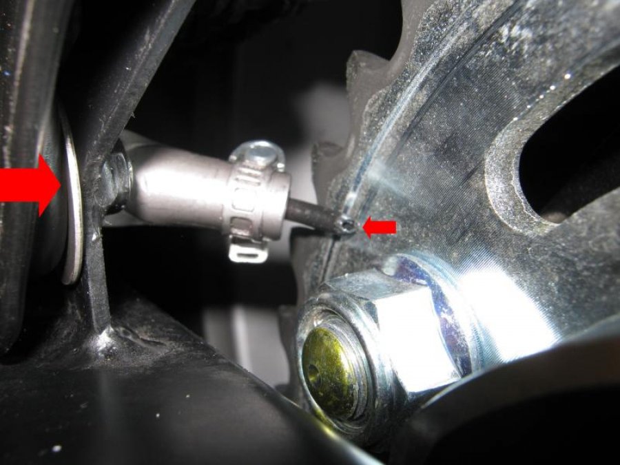 The Dispenser assembly can be secured on the chain guard bolt using the small dispenser plate and clip. The delivery tubing can be routed along the swing arm using self - adhesive cable clips. See our easy step installation guide - Dispenser Positioning. The nib should lightly touch the face of the rear sprocket, with the slash cut facing outwards.