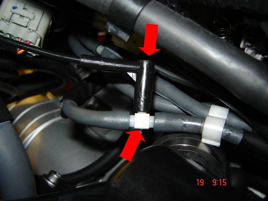 Locate the vacuum – there are two vacuum pipes running from either side of the fuel injection bodies, joined by solid blanking pieces. Cut one of the pipes and insert  the T-Piece from the Scottoiler kit. Then press the Damper Elbow onto the third leg of the tee. For further information see our easy step installation guide - Vacuum Connections General.
