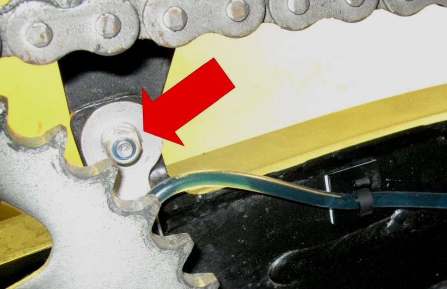 Assemble the dispenser mounting block and bolt the dispenser plate to the mounting block. Secure the dispenser on the dispenser plate using the dispenser clip. Clean the underside of the swing arm thoroughly, and prepare the area by wiping in one direction with the alcohol wipe and then firmly press the block on - with pressure, for 5 seconds. Ensure that the tip of the Injector touches the sprocket face, with the slash cut facing outwards.